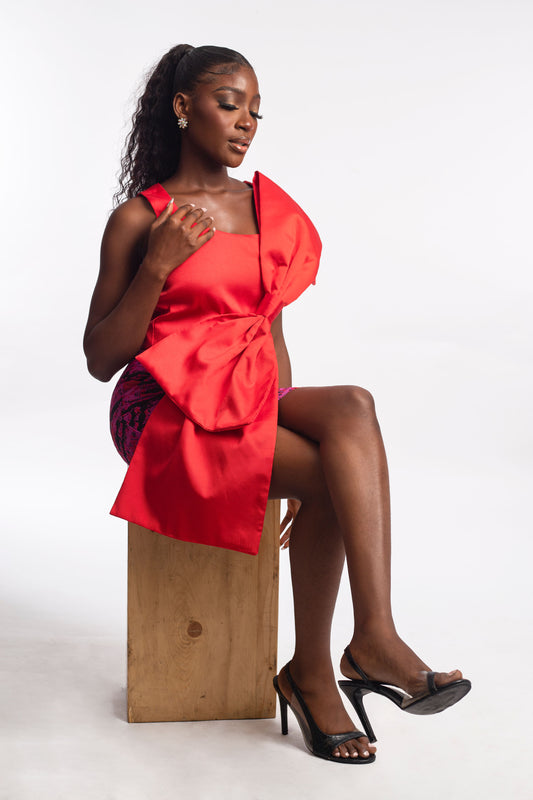 RED BOW TOP & PINK MARBLE TWEED SKIRT